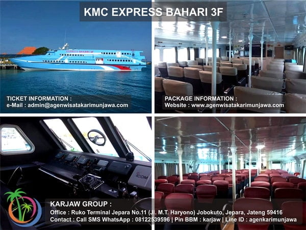 Jika pada saat sekarang ini sedang merencanakan perjalanan menuju pulau karimunjawa untuk aktifitas wisata, kami menawarkan harga paket wisata yang di dalamnya sudah termasuk tiket kapal express bahari. Dalam penawaran kami terdapat berbagai jenis penginapan yang bisa anda pilih dan sesuaikan. Dengan fasilitas tiket kapal express bahari maka perjalanan penyeberangan anda akan lebih cepat jika di bandingkan dengan jenis kapal lainnya yaitu Kapal KMP Feri Siginjai.